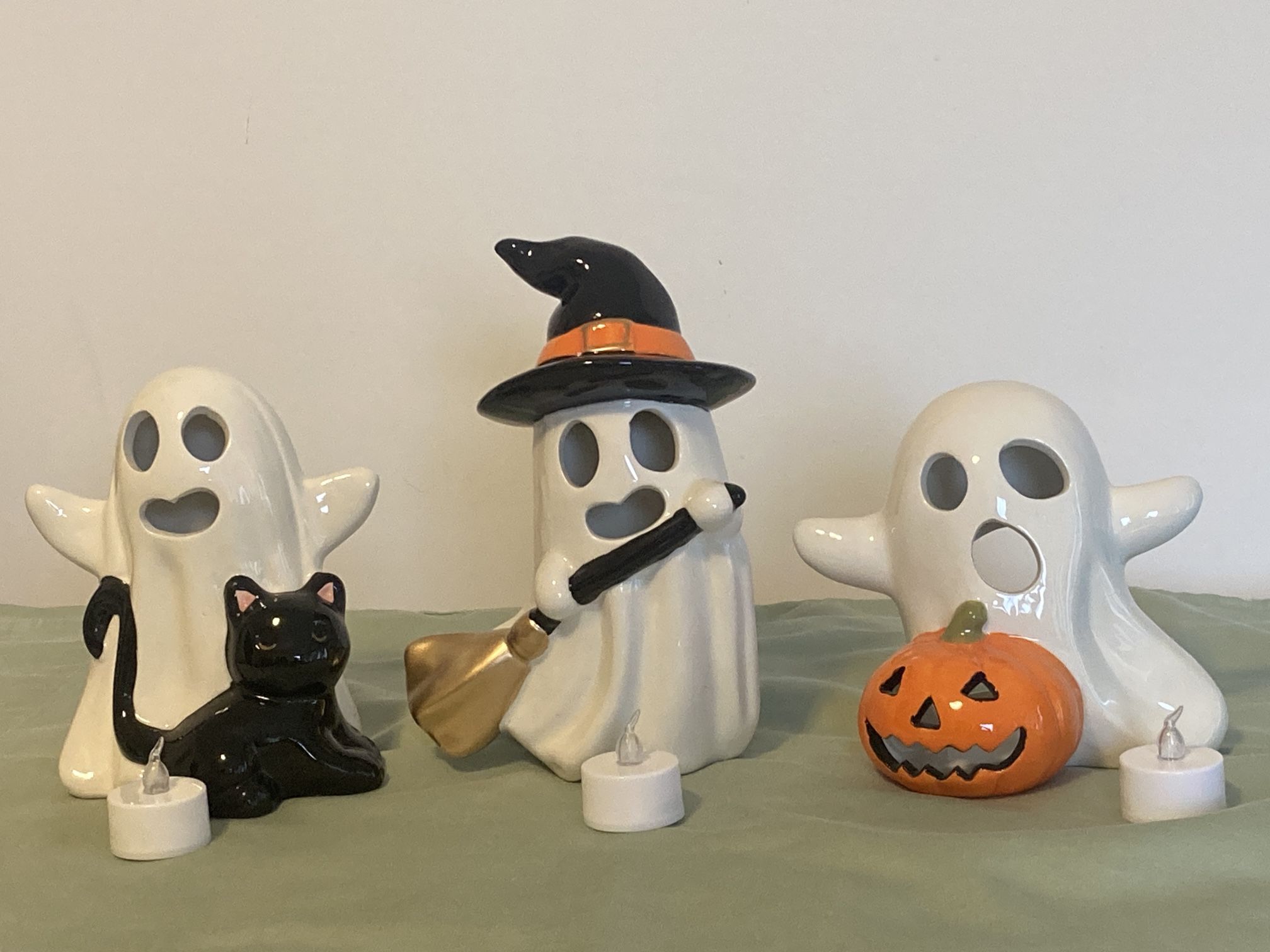3 Ceramic Ghost Halloween figurines. Opening for T lights, ghosts are 6.5” high.
