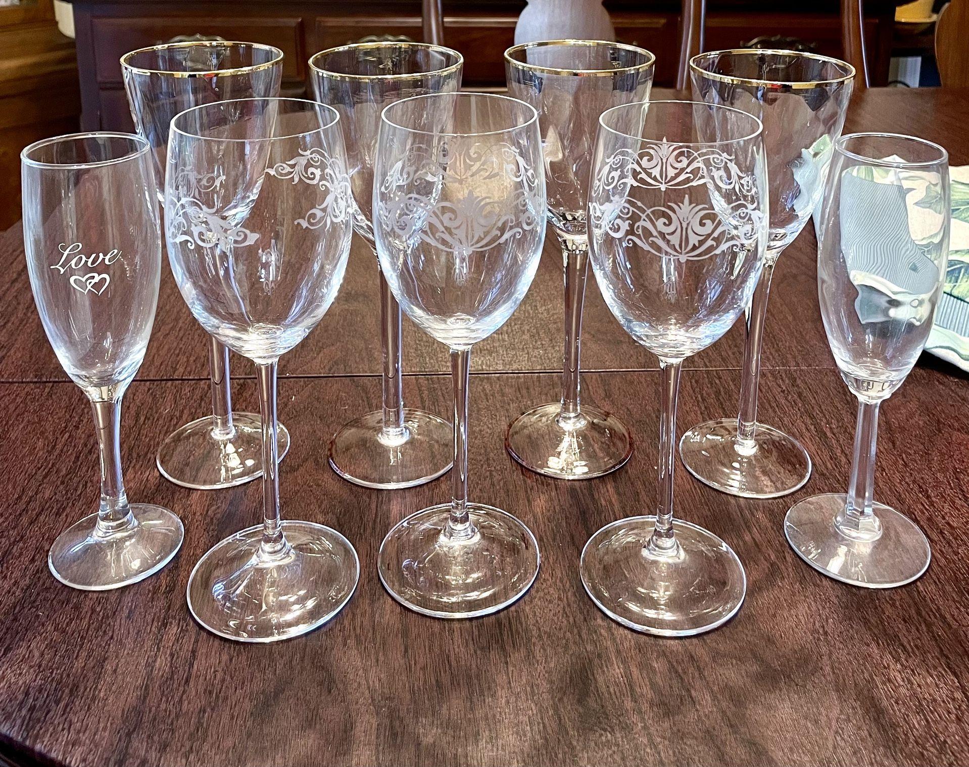 4 gold trimmed, 3 etched 2 with love on it wine glasses