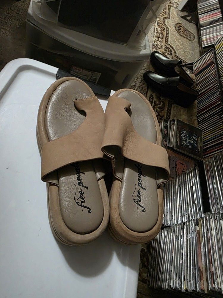 Free People Beige Leather Platform Tong Sandals Women Size 8