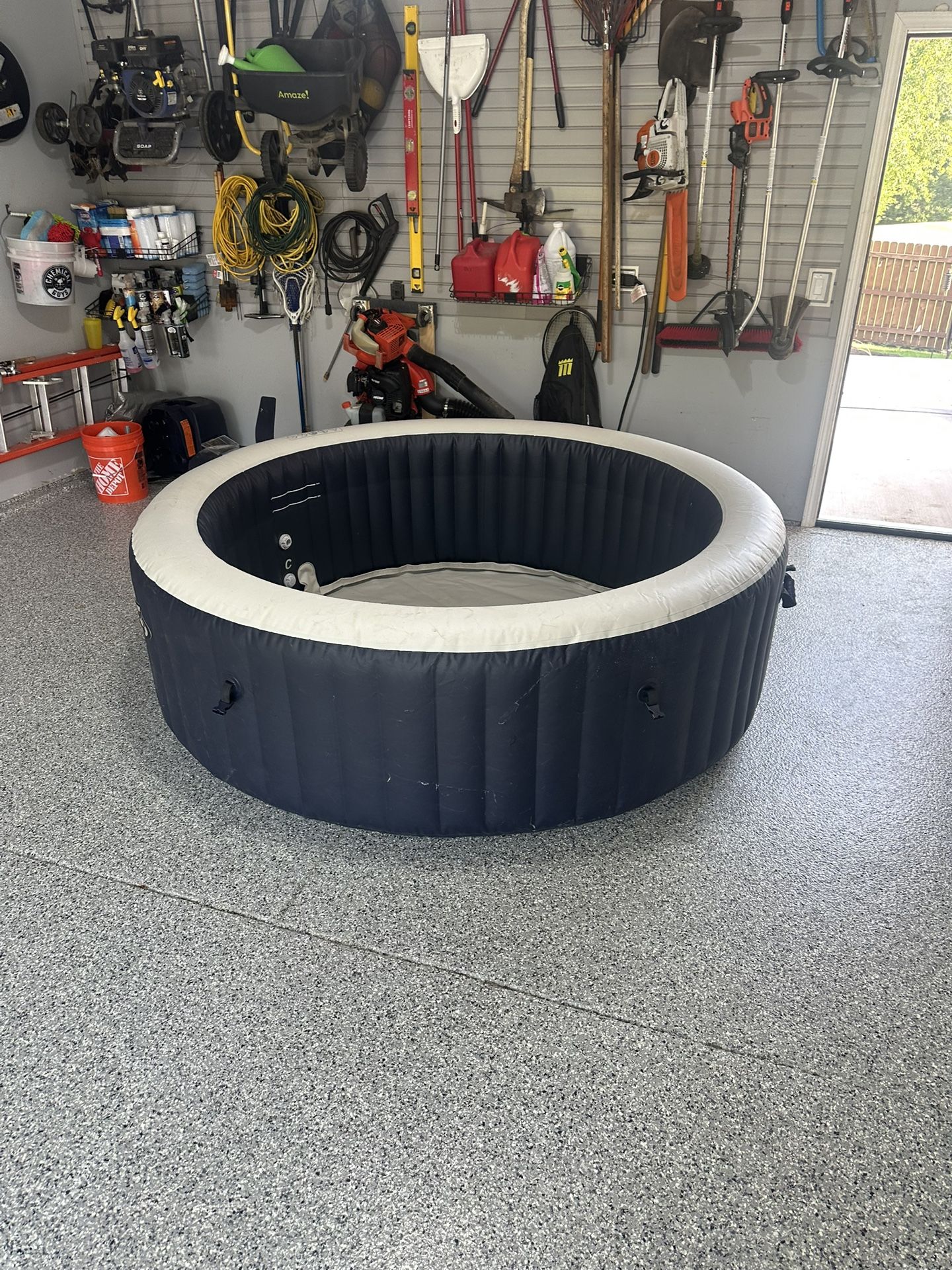 description attached, 6 person hottub. Bought a real one so time to get rid of this. Works to 104! Perfect for fall coming. Comes with extra motor which is rare!! And I have all fun attachments like in tub seats and head cushions
