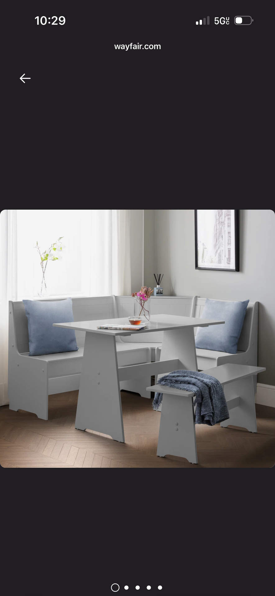 BREAKFAST NOOK DESIGN: Compact L-shaped layout fits neatly in small kitchens, dining corners, or open-plan living areas. HIDDEN STORAGE: Both benches include lift-up seats with built-in compartments, ideal for storing linens or dining essentials. PAINTED FINISH: Sleek painted finish offers a clean, versatile look to complement a variety of home decor styles. DIMENSIONS: Measuring H 34 inch (85 cm) x W 62 inch (158 cm) x D 47 inch (120 cm) with a net weight of 59kg. Bench: H 17 inch (43.7 cm) x W 43 inch (109 cm) x D 12 inch (30 cm) Table: H 29 inch (73.7 cm) x W 43 inch (109 cm) x D 25.5 inch (65 cm) WHAT’S INCLUDED Includes L-shaped corner bench, freestanding bench, and dining table. Assembly required. Rather sale than return. It has all the parts but my circumstances have changed. The instructions are digital