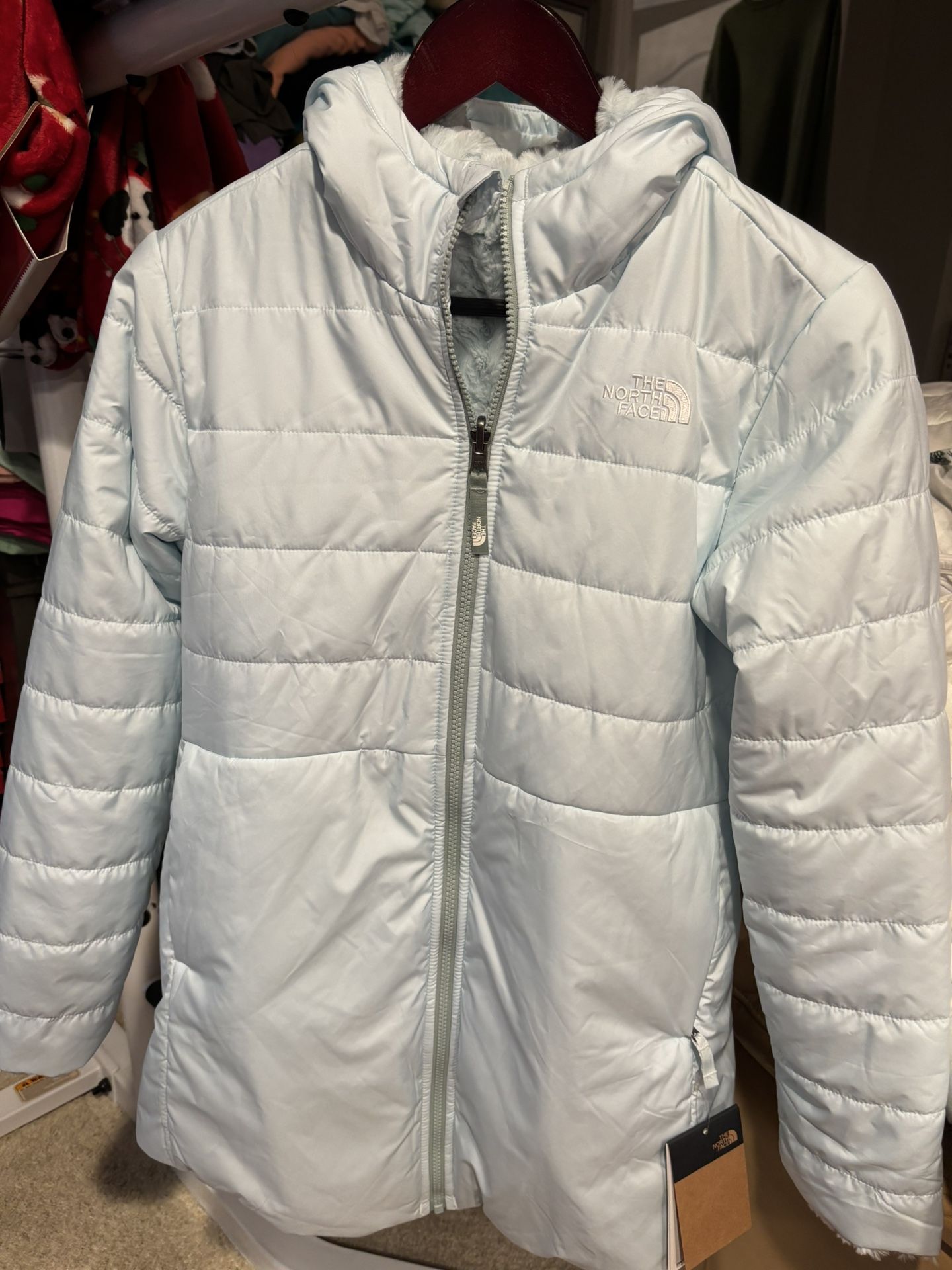 Brand new kids, Northface jacket/parka retail price is $129 size is XL/18 color is listed as ice blue