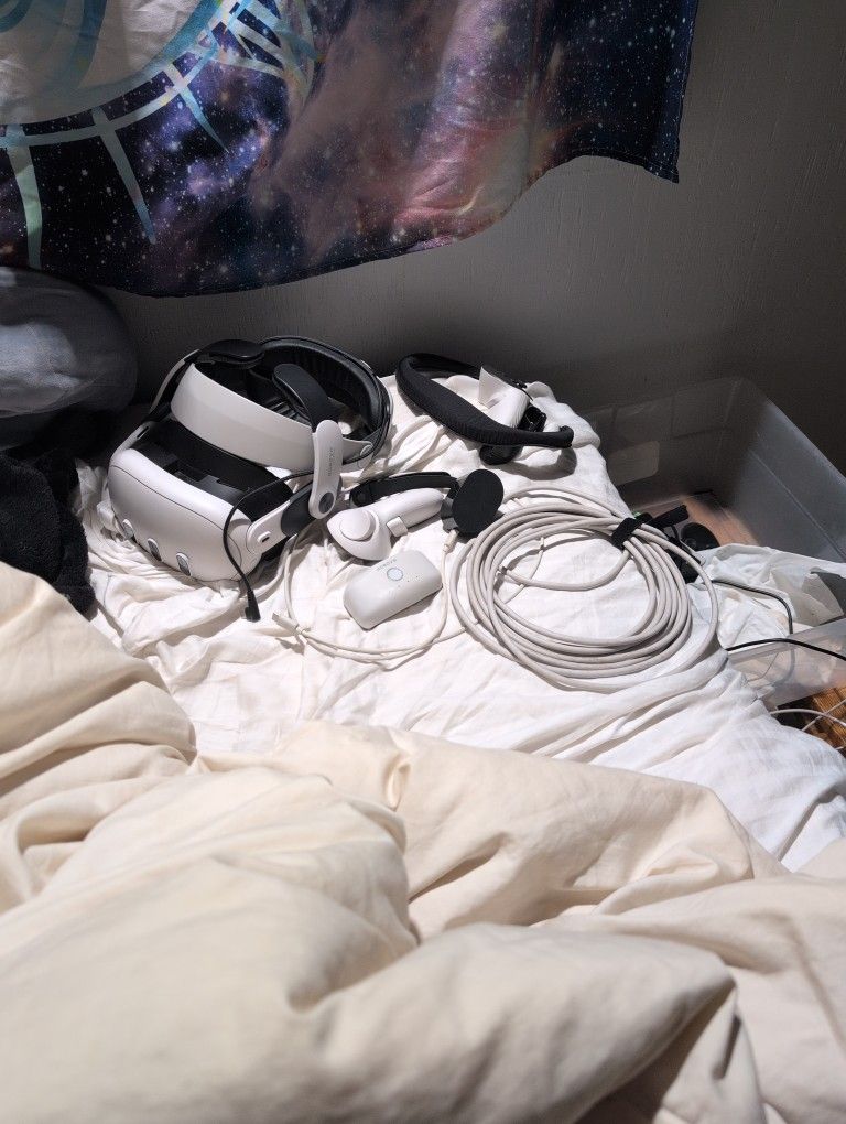 Used all works good I currently use it moving new to sell comes with bobovr head strap which I'd 45 new on Amazon syntech cordI think is 10 ft cable charging block