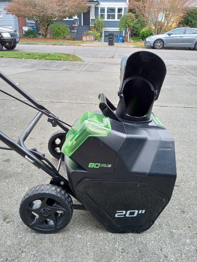 Greenworks one stage 80v snowblower. Brushless electric motor. 20" width. 6" wheels 33 pounds total weight. 180 degree rotating chute. Two LED lights. Used one time. Comes with battery, charger and manual.