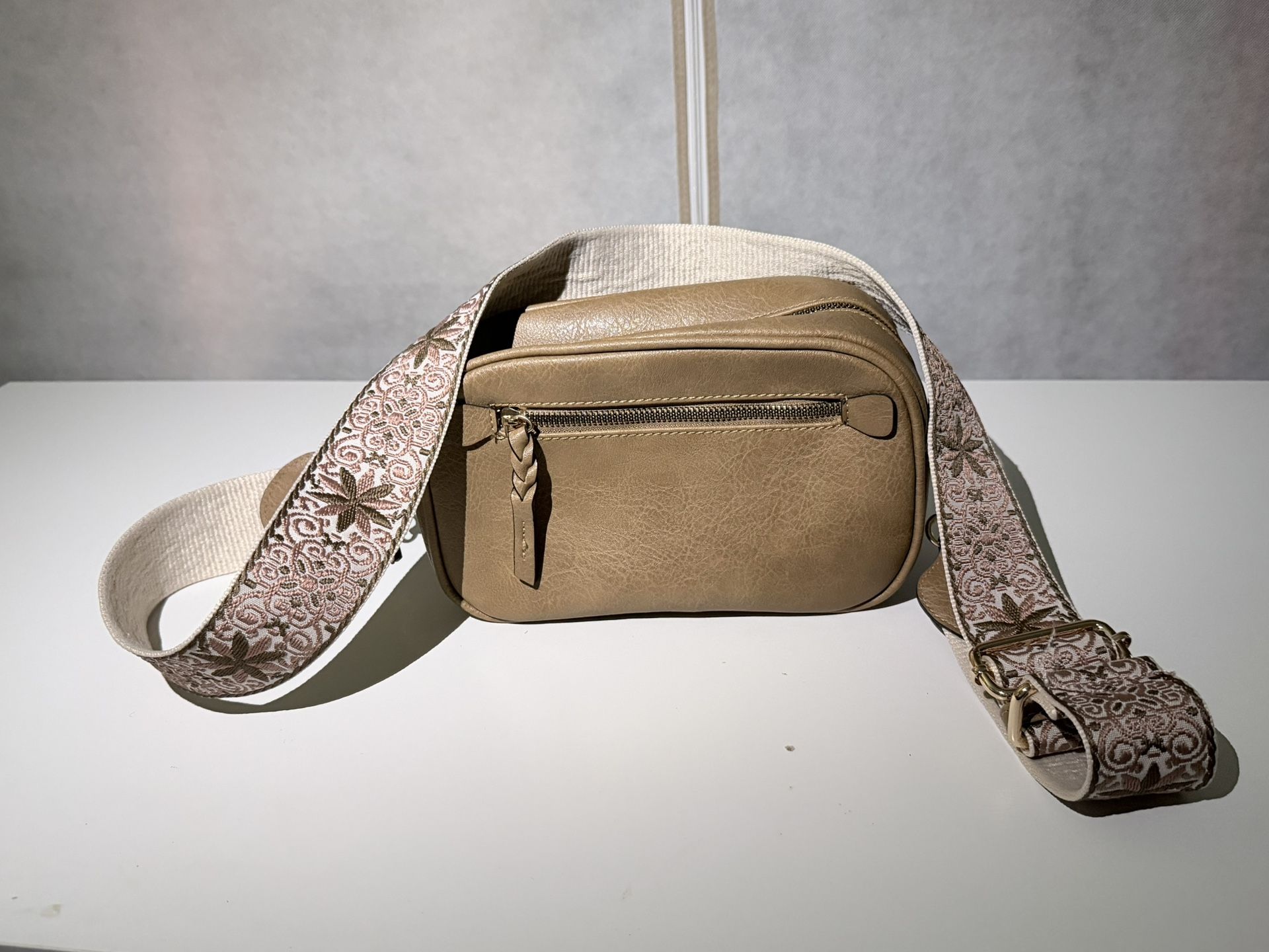 Mocha faux leather crossbody bag with a patterned boho guitar strap.