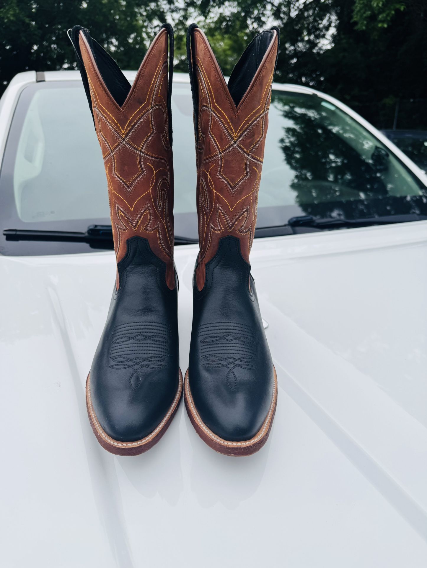 Never worn, brand new condition. Classic two-tone leather (black foot, brown shaft) with stitched detailing. Snip/square toe design, perfect for both casual and dress western wear. Retails for over $250 – letting them go for $200 OBO.