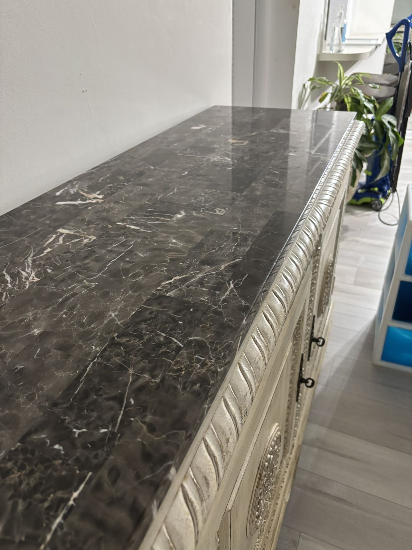 Beautiful vintage marble-top credenza with hand-carved detailing and an antique white finish. Features a solid stone marble top with natural veining and ample storage below. Heavy, sturdy, and well-made — perfect as a dining buffet, entryway statement piece, or media console.