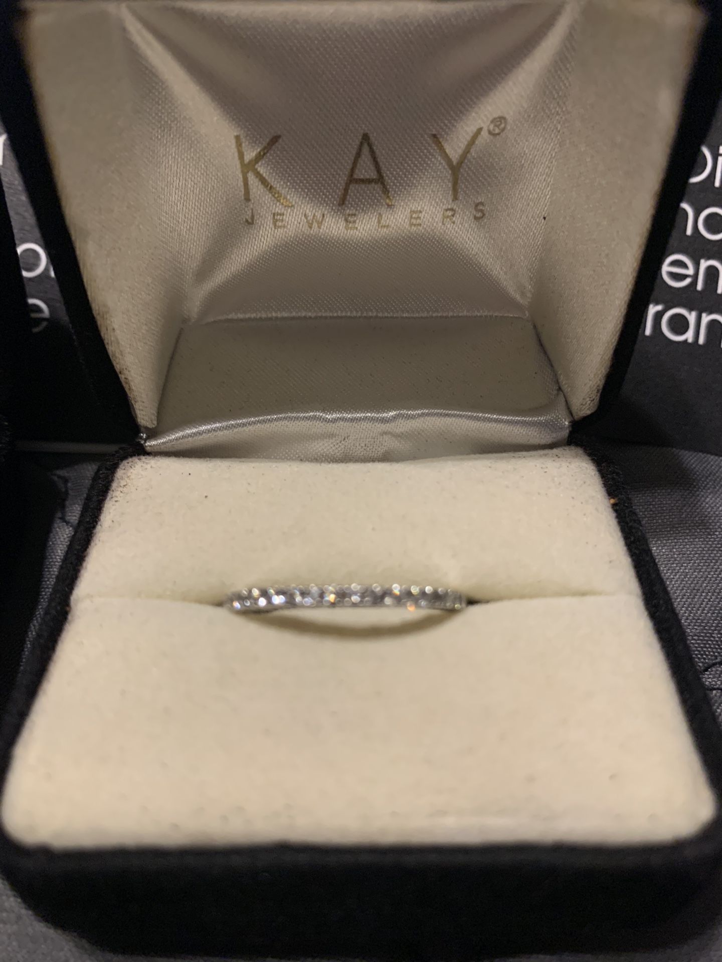 This lovely anniversary band is styled in versatile 10K white gold and decorated with round diamonds totaling 1/20 carat in weight. Only wore three times. You can get as the wedding set if you prefer or sold separately.