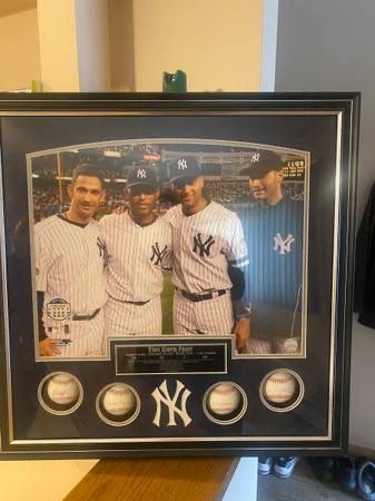 I have a beautiful Yankees autograph, baseball display shadowbox. There are four autographed baseballs one each for the following, Derek Jeter, Jorge Posada, Andy Pettite, and Mariano Rivera. It comes in case in a shadowbox with a giant color photo of the four of them. The photo is by the company photo file and there is a tag on the back from Steiner sports the box measures 27 inches in height and 27 inches in length and 3 3/4 inches deep. This will look tremendous on any wall. This is a must have for the Yankees fan. Please see the pictures that I have provided for you. I am asking $1900 or best reasonable offer. I am located in Hopewell Junction