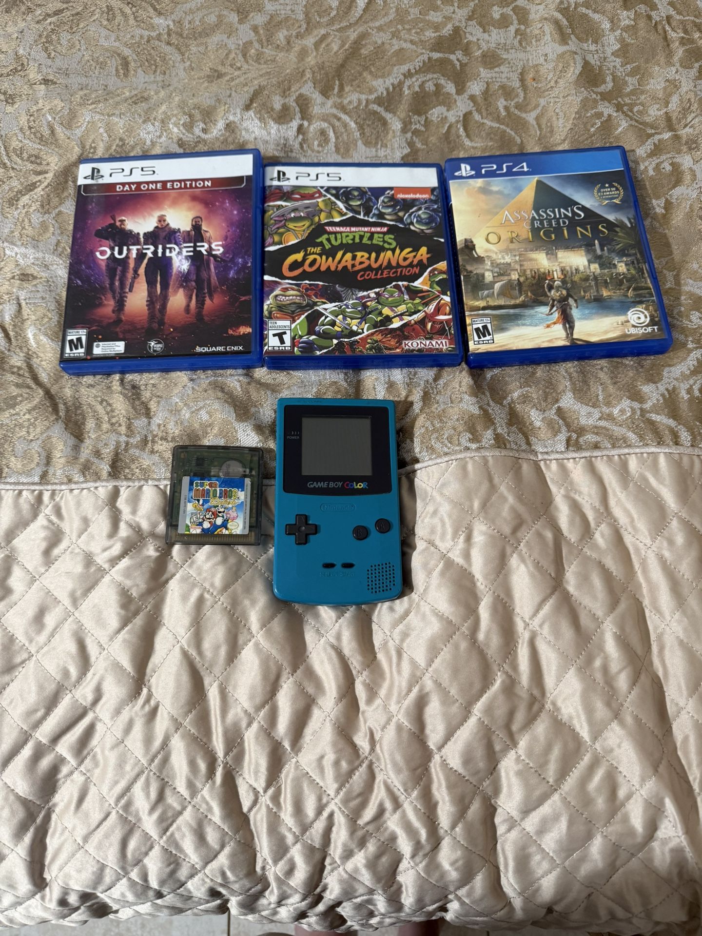 All disk game been tested they work good condition. The only problem is the game boy it’s stuck it turns on but my brother got the game backwards stuck from the gameboy. All for $50 Or Outsiders ps5 $10 Turtles ps5 $10 Assassin $5 The game boy stuck problem $30 plus the game Mario goes with it or all for $50 pick up in Mission Hill I hear offers