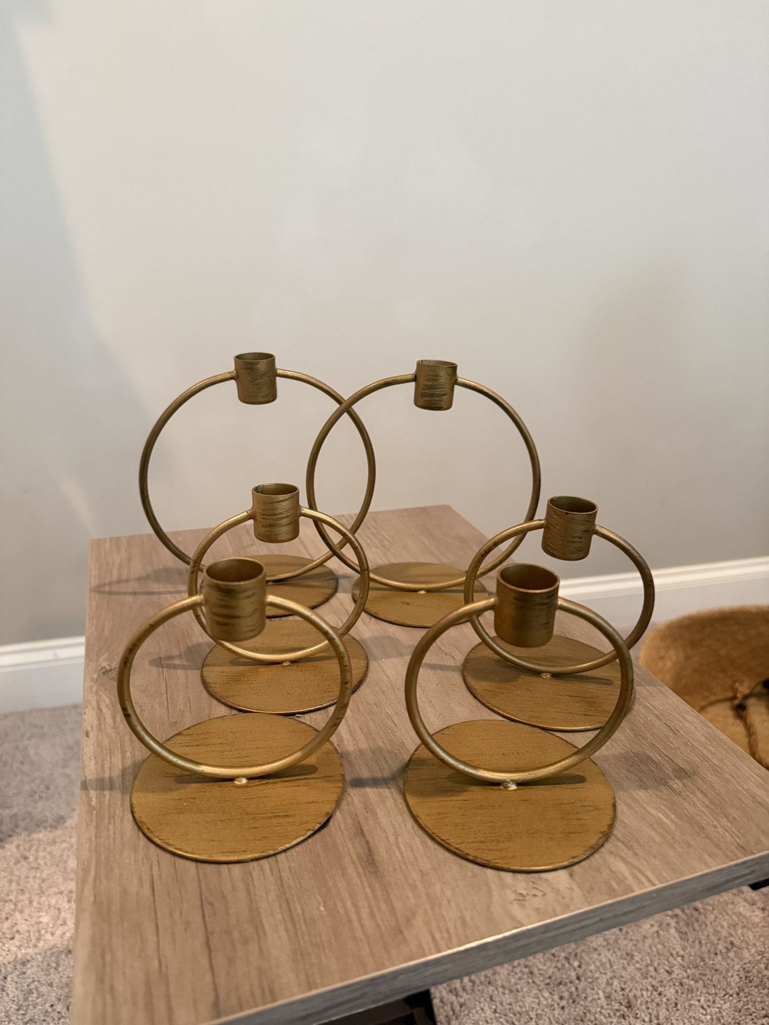 Brushed gold round taper candleholders. Set of 6. $12