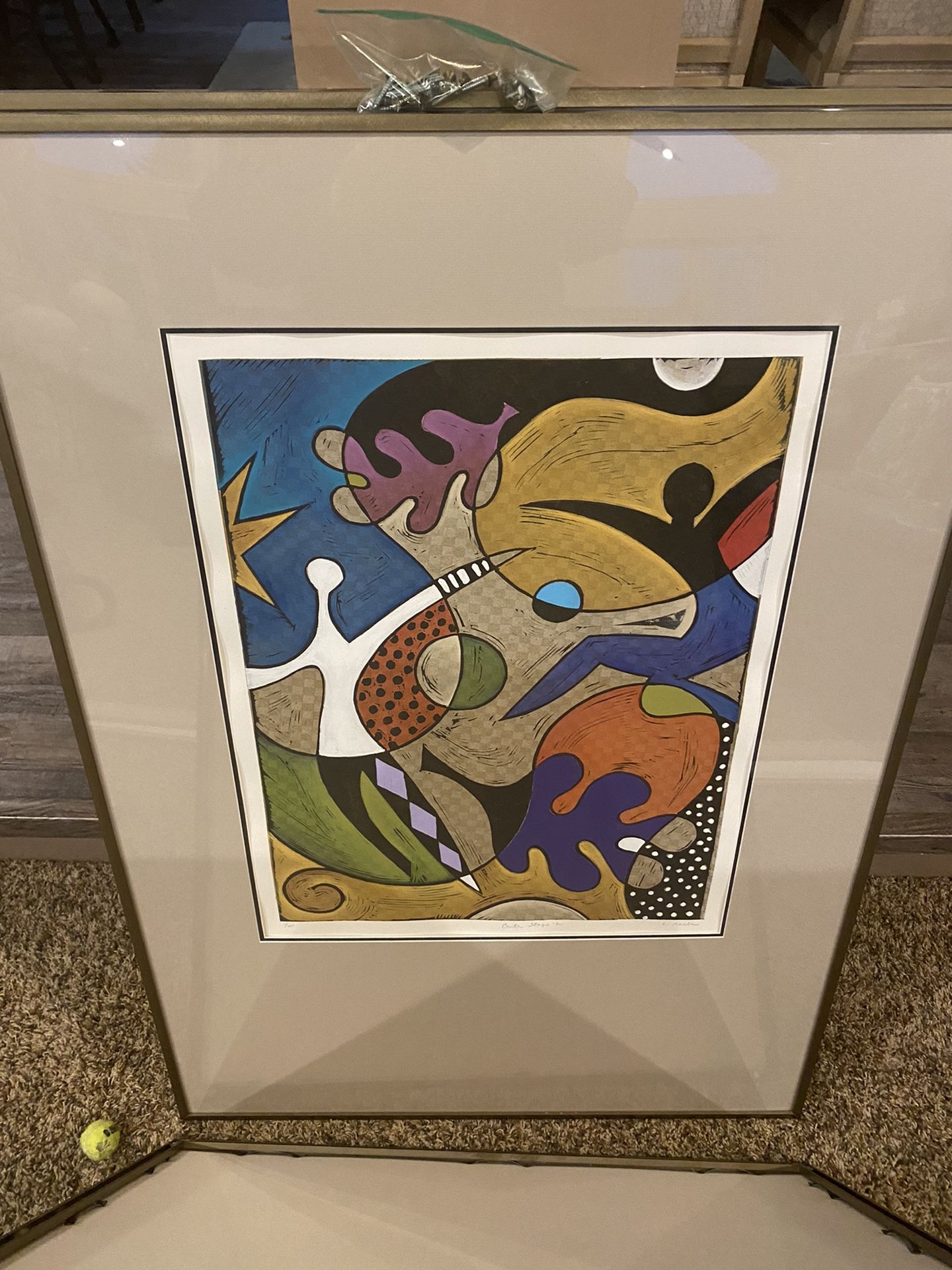 Sizes: 30 3/4 W X 44 1/4 L 3 paintings by Lisa Kesler customer framed. 1) Center Stage 1. Center Stage 2. 3) Zydero Swing 1 are the names of the paintings.