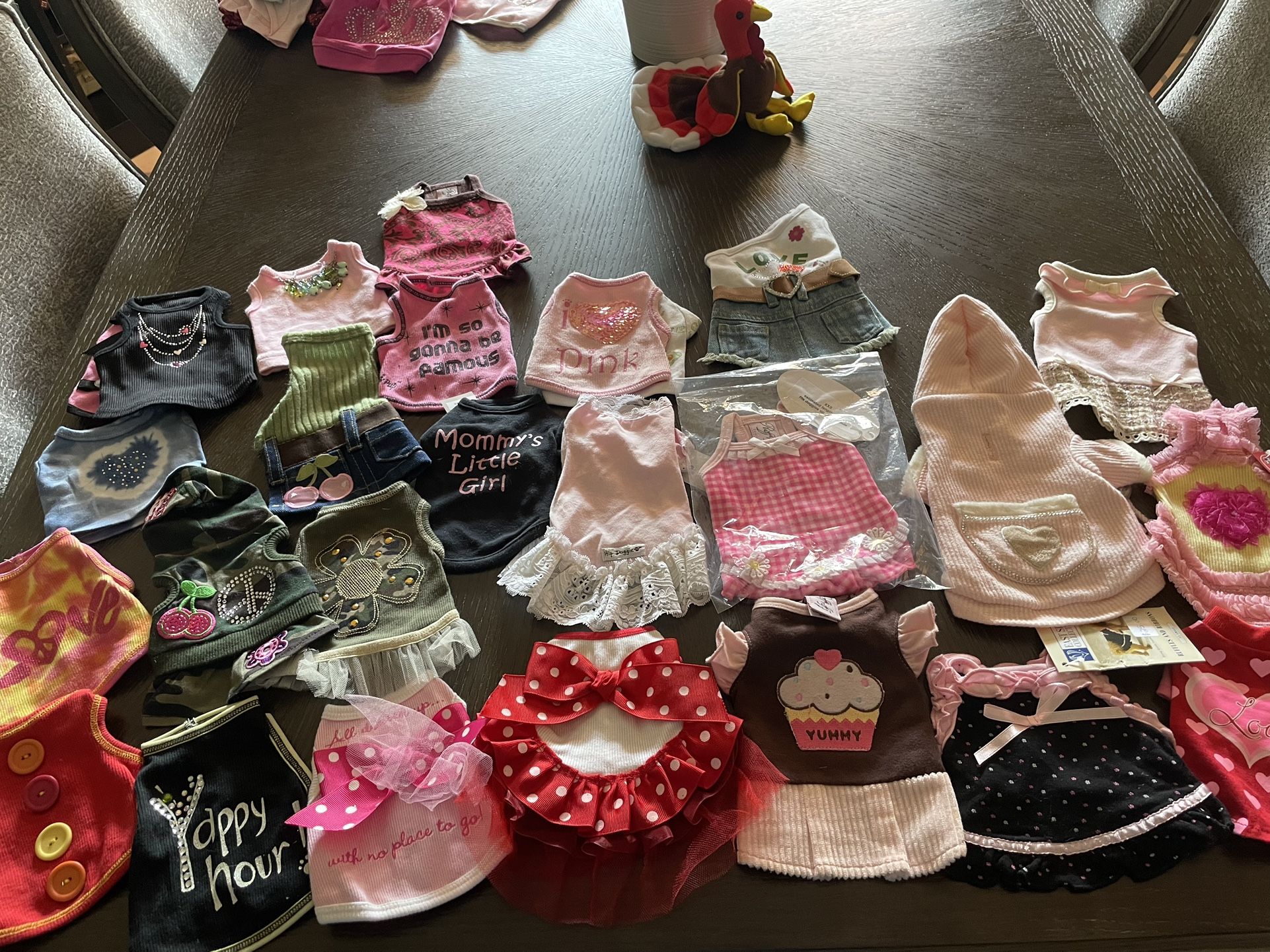 I have a lot of dog clothing for your little one size XX Small. all brand new with tags never used. Starting at $10 and up