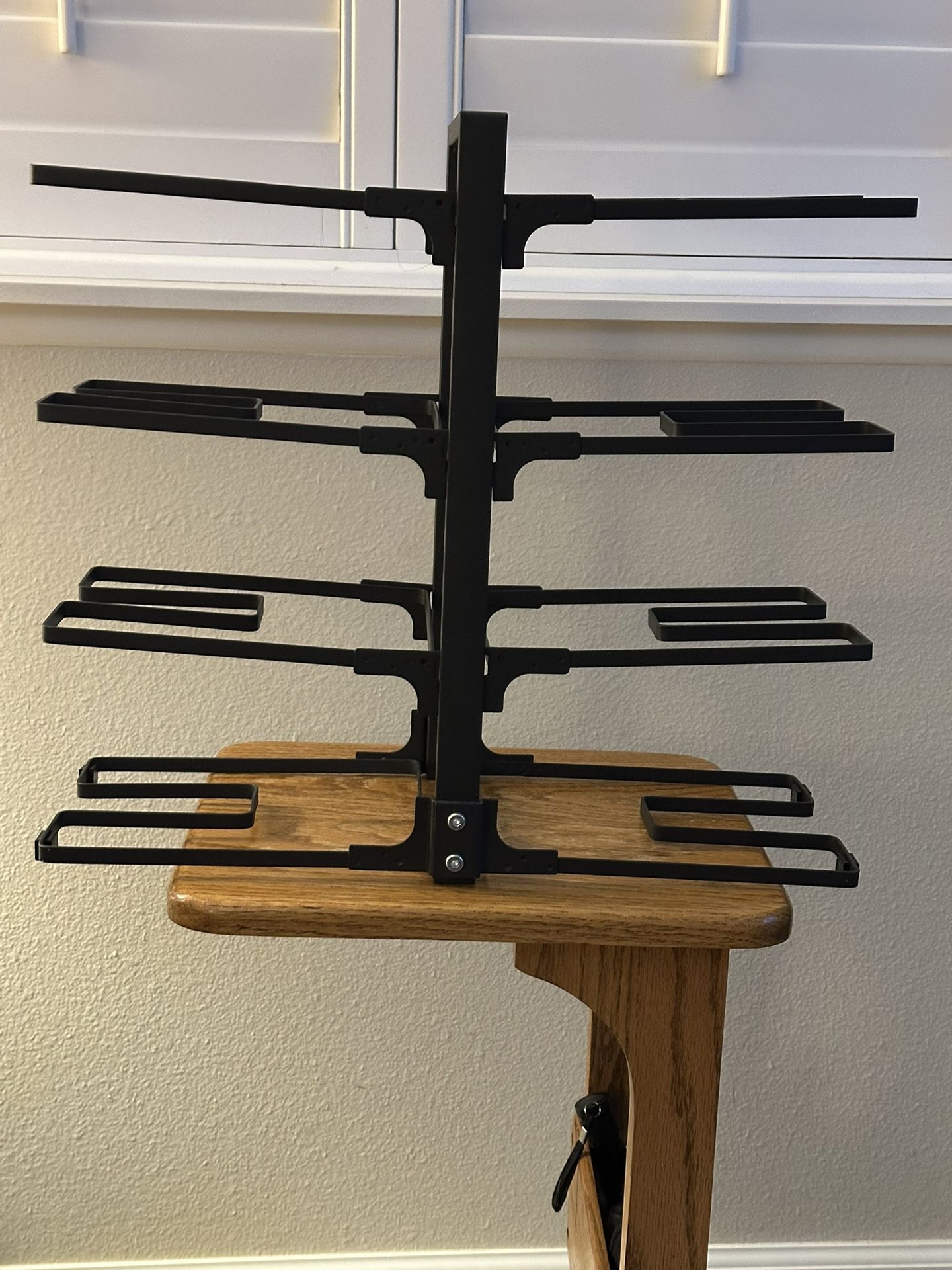 The two bottom tiers are fixed in place forming the base of the organizer. The other tiers can be adjusted for height allowing for different sizes of pots and pans. Overall dimensions with all tiers in place: 16.75” tall, 19” long, 8.5” wide. Flat black finish.