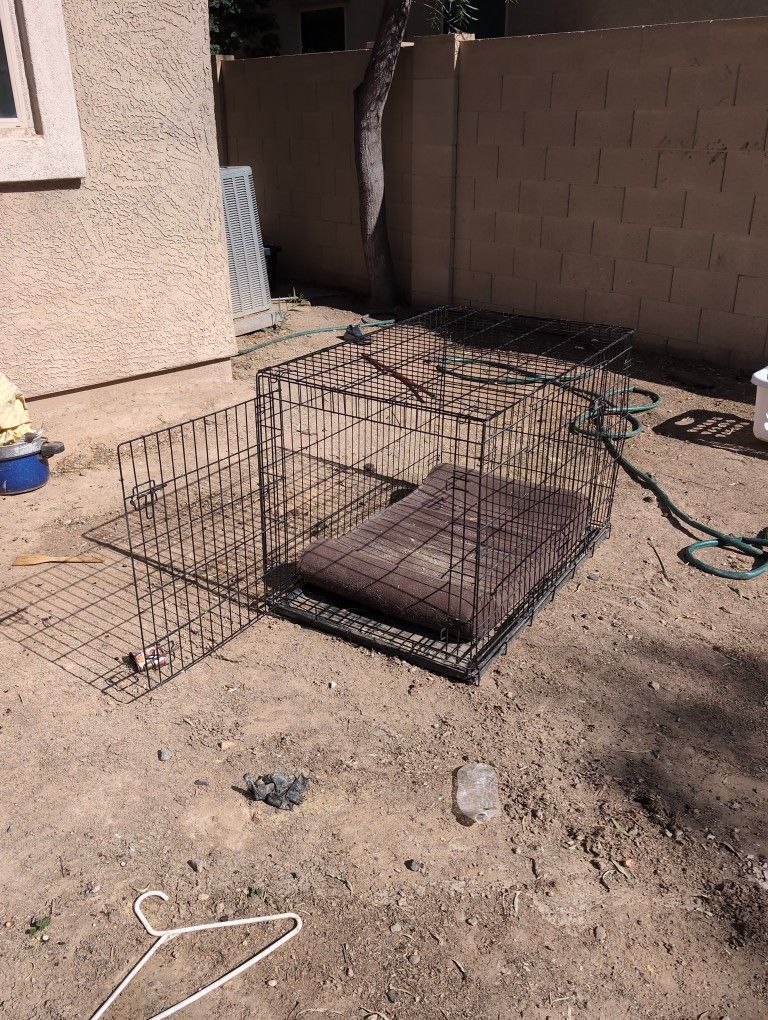 I'm selling a large dog crate that has a tray inside and a dog bed