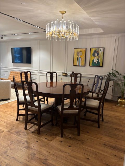 This is a large, elegant 64” dining table with a single fluted pedestal base and one 20” leaf. Seats 8 comfortably and 12 with leaf for larger gatherings. Originally cost $14,900. Includes 12 Queen Anne style chairs (2 with arms) professionally covered in a cream colored textured fabric with extra padding for comfort. Classic Ralph Lauren/Henredon design. Very good condition with minor, normal wear. Buyer is responsible for pickup. Tabletop can be removed for easier transport. Located in Arlington (Rosslyn).