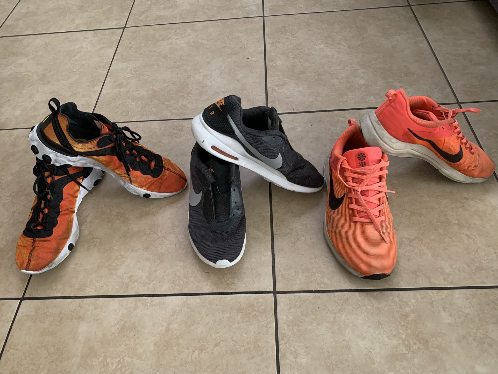 Nike shoes Nike React in last pic is 10.5 other 2 are size 10 orange Nike downshifted are a wide 10.. asking $15 each Silverado ranch area no delivery
