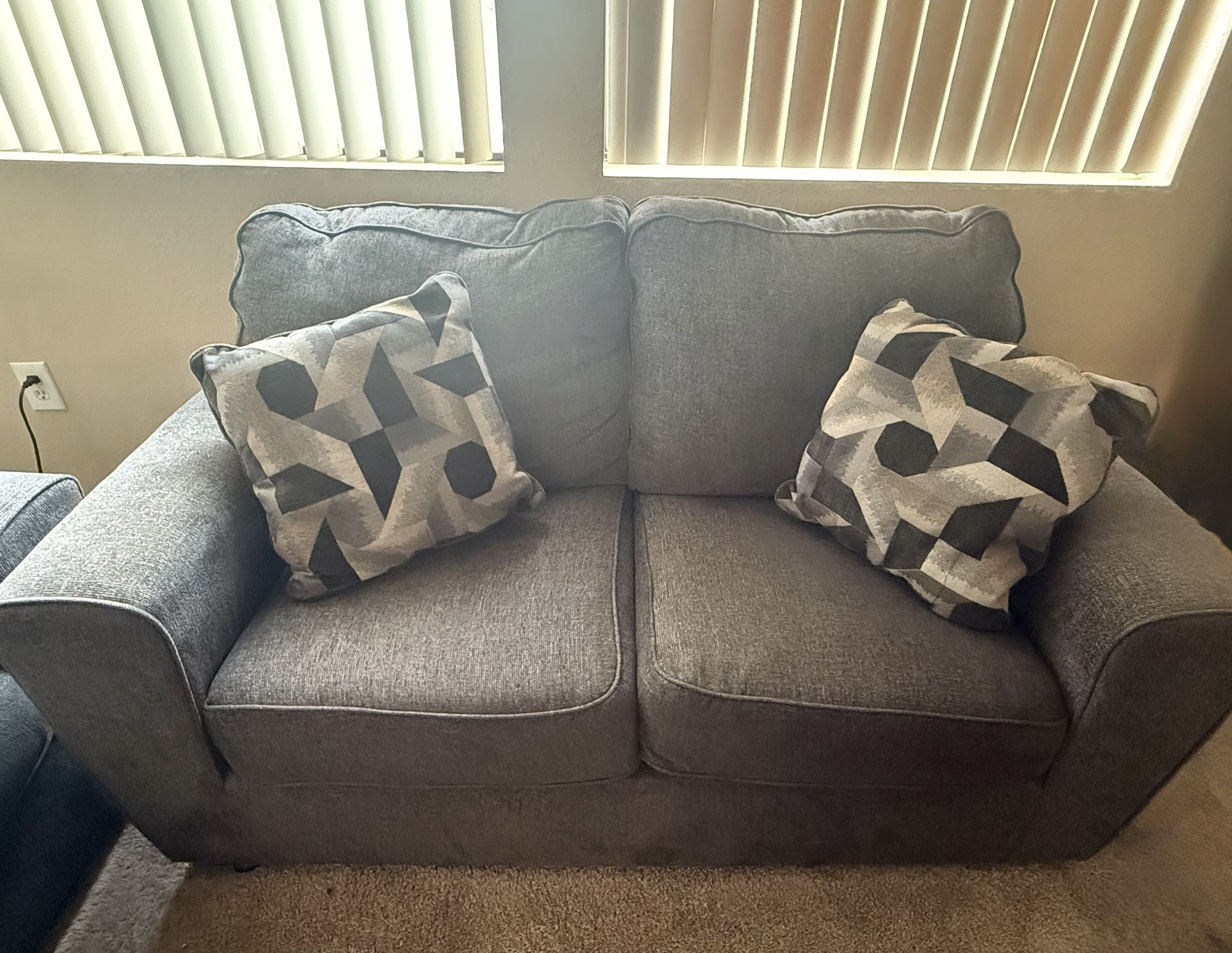 Love seat couch and three seat couch set with pillows. Normal use for living room. Three seat is measured at 5 ft 6 in. Love seat is measured at 4 ft 6 in. 4 pillows included.