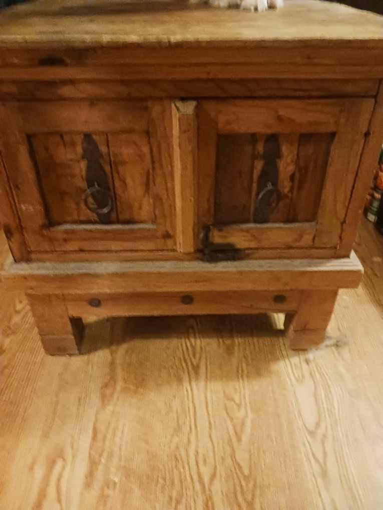 Cubed shaped coffee table / nightstand. 2 swinging doors that open and latch closed. Cabinet space on the inside. 26 inches x 26 inches wide. And is 2 feet tall. Wood material.