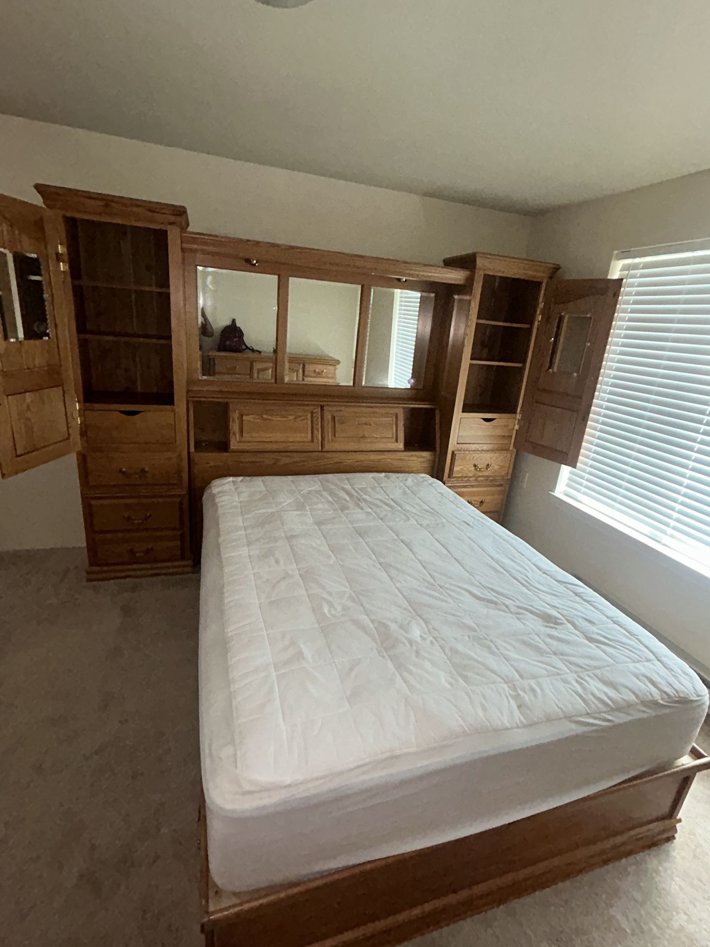 Bedrooms set has 3 mirrors attached to the head board , 2 mirrors within bed side cabinets and 12 drawers. Real Oak Wood. Furniture is disassembled is a climate controlled storage unit. Set comes with an additional mirror and a dresser. Queen size