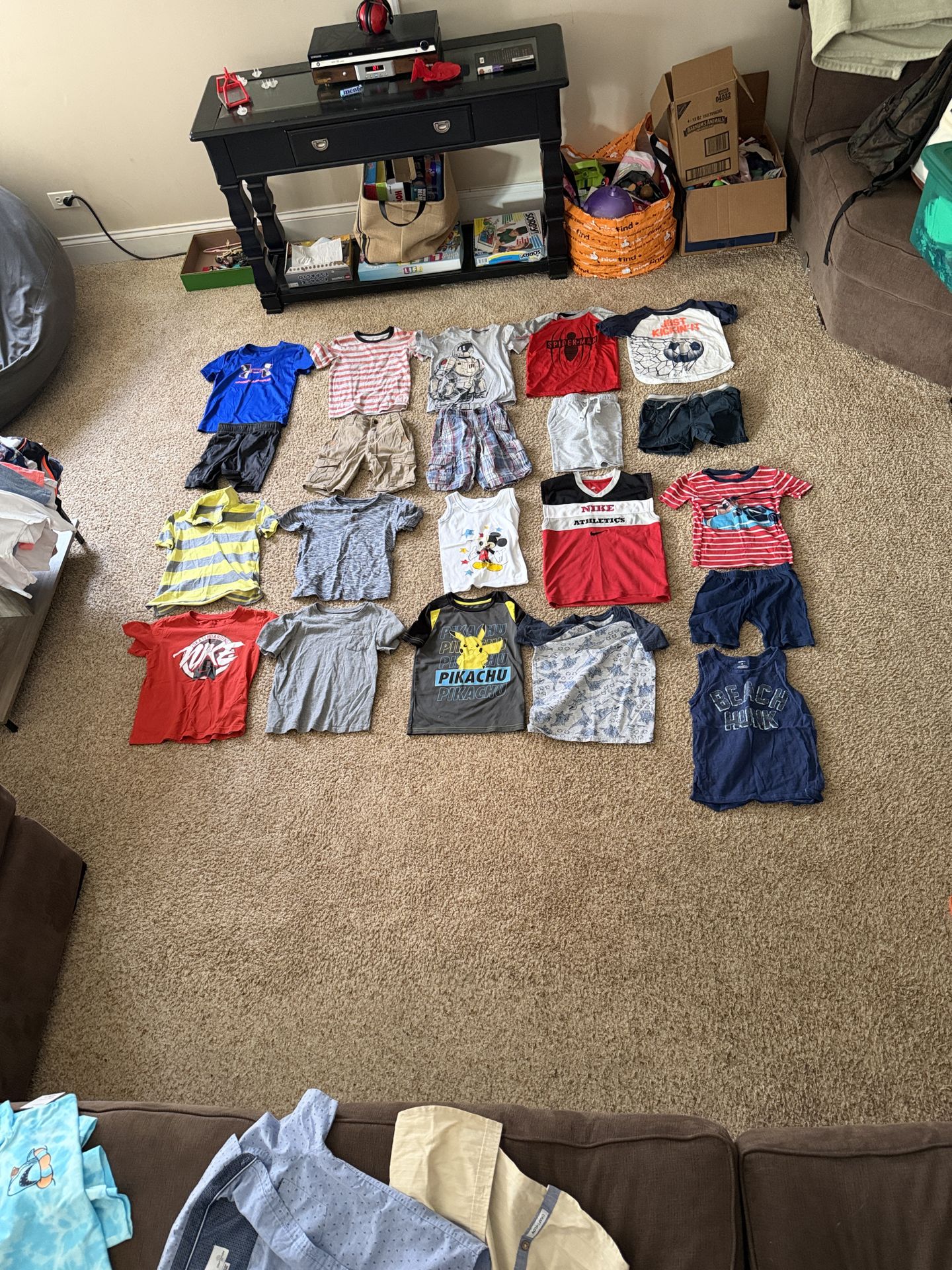 Boys size 6 spring/summer clothes. No holes but some have light stains. Red Nike tank & black shorts have snags. Pj top has cracks in print