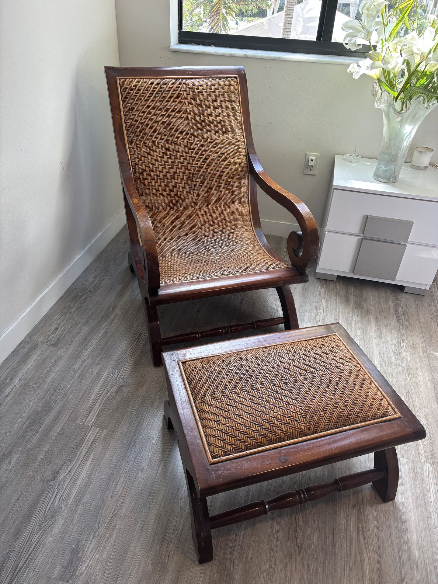 Pre-owned in good condition. Shows scuff marks on back, front and sides as well as slight discoloration on the top of both arm rests. The bottom of the chair is missing 1 glider pad. The seat (shown in the 4th listing pic) show s signs of wear. Approximate chair measurement (looking from the front of the chair) 24”L X 29” W X 35” H Footstool approximately measures 24” L X 19.5” W X 12.5” H Please review the listing photos for detail and condition. Thank you for browsing ! MIAMI, FL PICKUP ONLY