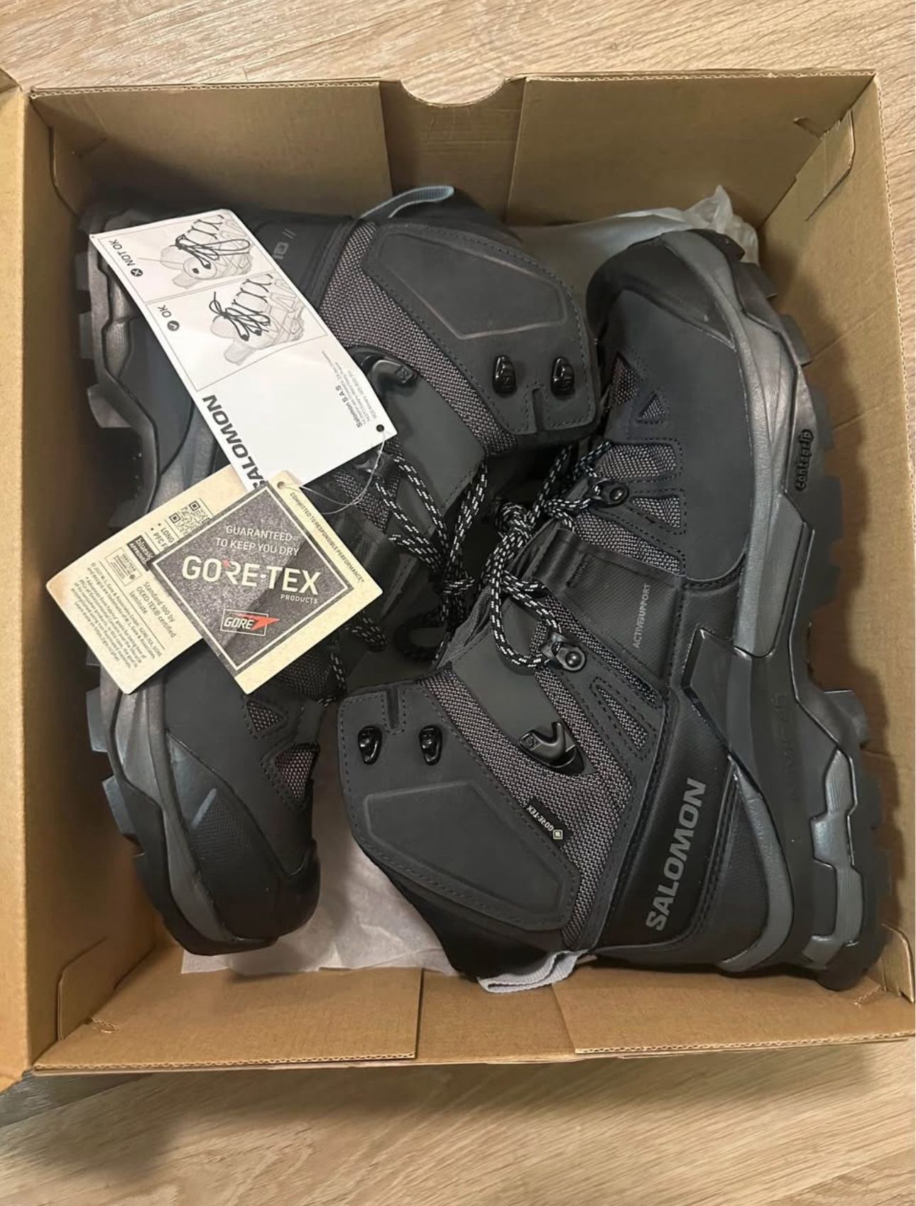 NEW - Salomon Quest 4 GORE-TEX Hiking Boots - Men's Size 10. I’m selling because size is too big and can’t return. Description: Built for long expeditions and tough conditions, the men's Salomon Quest 4 GORE-TEX hiking boots deliver grip, support and control to keep your stride stable and smooth-even when you're tired. • Inspired by Salomon trail-running expertise, these backpacking boots respect the natural flexion of your feet for a smooth ride that flows from step to step • GORE-TEX waterproofing keeps your feet dry from the outside and the inside • 4D Advanced Chassis™ construction harnesses 2 different midsole components for enhanced foot control and active comfort • Enhanced stability from the updated 4D Advanced Chassis guides the foot, targeting sensitive articulation even on rough terrain • The 4D Advanced Chassis encases your foot for extra support around the heel and helps reduce muscle fatigue, especially when wearing a heavy backpack • All Terrain Contagrip® rubber outsoles are built for the widest variety of terrain; they deliver durability and confidence on wet, dry, hard or loose surfaces
