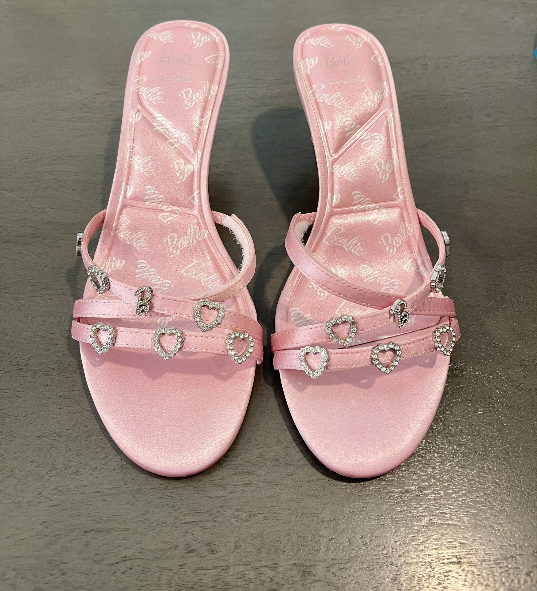 PRE-OWNED Excellent conditions These are the Barbie Aldo Mule Pink Kitten Heel Size 7.5 (EU 38). These beautiful kitten heels are perfect for a special occasion or everyday wear with comfort. The are like new and all charms are intact. (View all pictures ) SIZE 7.5 Measurements: 9 1/2in Long 4in Wide 2 1/2in Heel