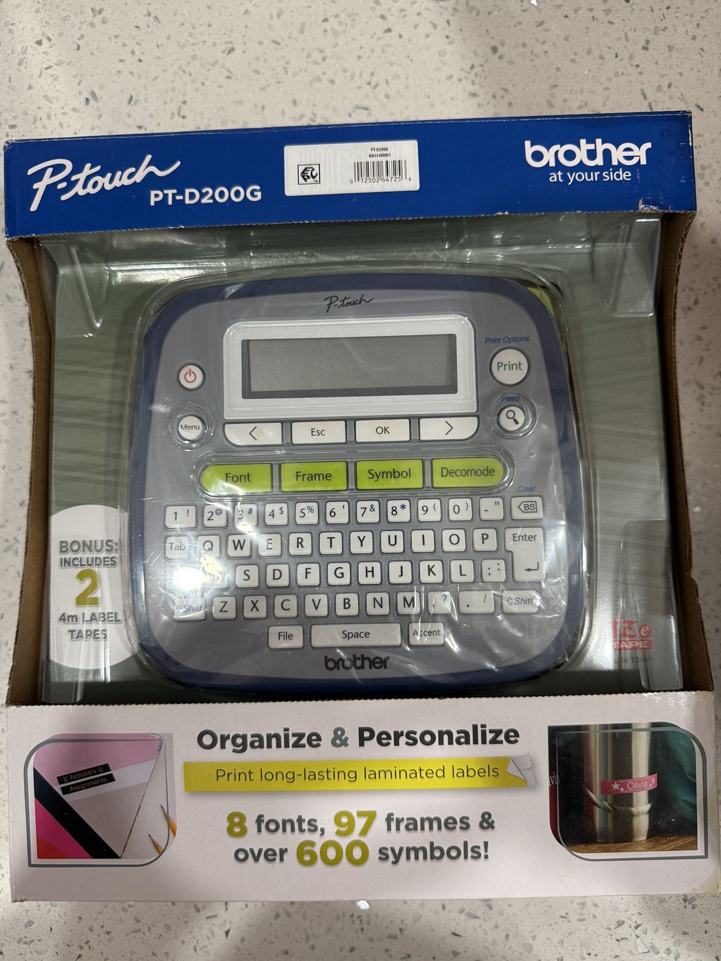 Brother P-Touch PT-D200G label maker in great condition. Works perfectly and is easy to use. Great for home organization, office, school, or small business. Includes: • Brother PT-D200 label maker • 2 laminated TZe starter tapes – Black on White (12mm / 0.47”) – Black on Clear (12mm / 0.47”) • Original box Features: • QWERTY keyboard • LCD screen with preview • 8 fonts, 97 frames, 600+ symbols • Prints up to 2 lines • Uses durable laminated TZe tapes • Ideal for bins, cables, kitchen items, kids’ items, office supplies Uses 6 AAA batteries or AC adapter (not included). Local pickup only. Cash or Cash App only. Message if interested.