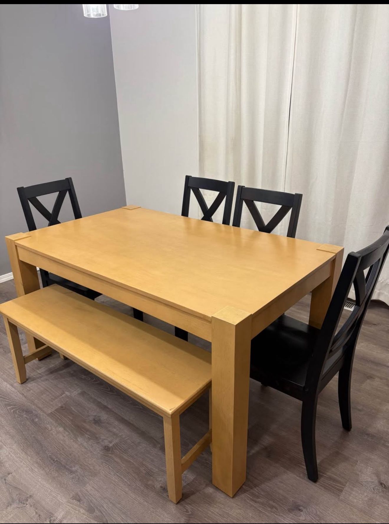 Nice medium soze dining table set with chairs and bench sits 6 people Pick up in Sandy Or can dissemble and deliver for a fee