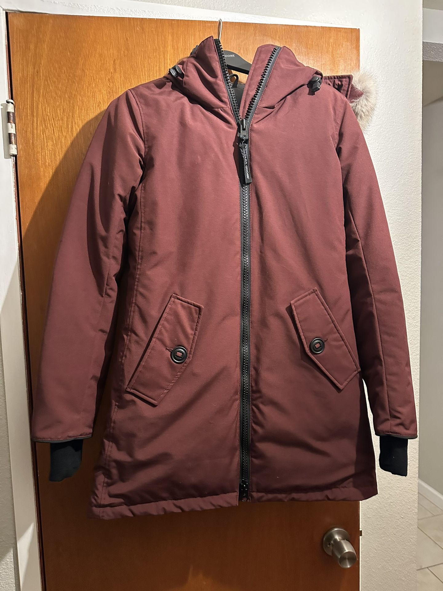 Beautiful winter coat. Only been used once. Practically brand new. Burgundy color with real fur hood trim. Practically brand new and my loss is your gain. Get yourself ready for the cold with this jacket and treat yourself a bit. I'm open to offers but please don't low ball me. Originally bought for $1,200