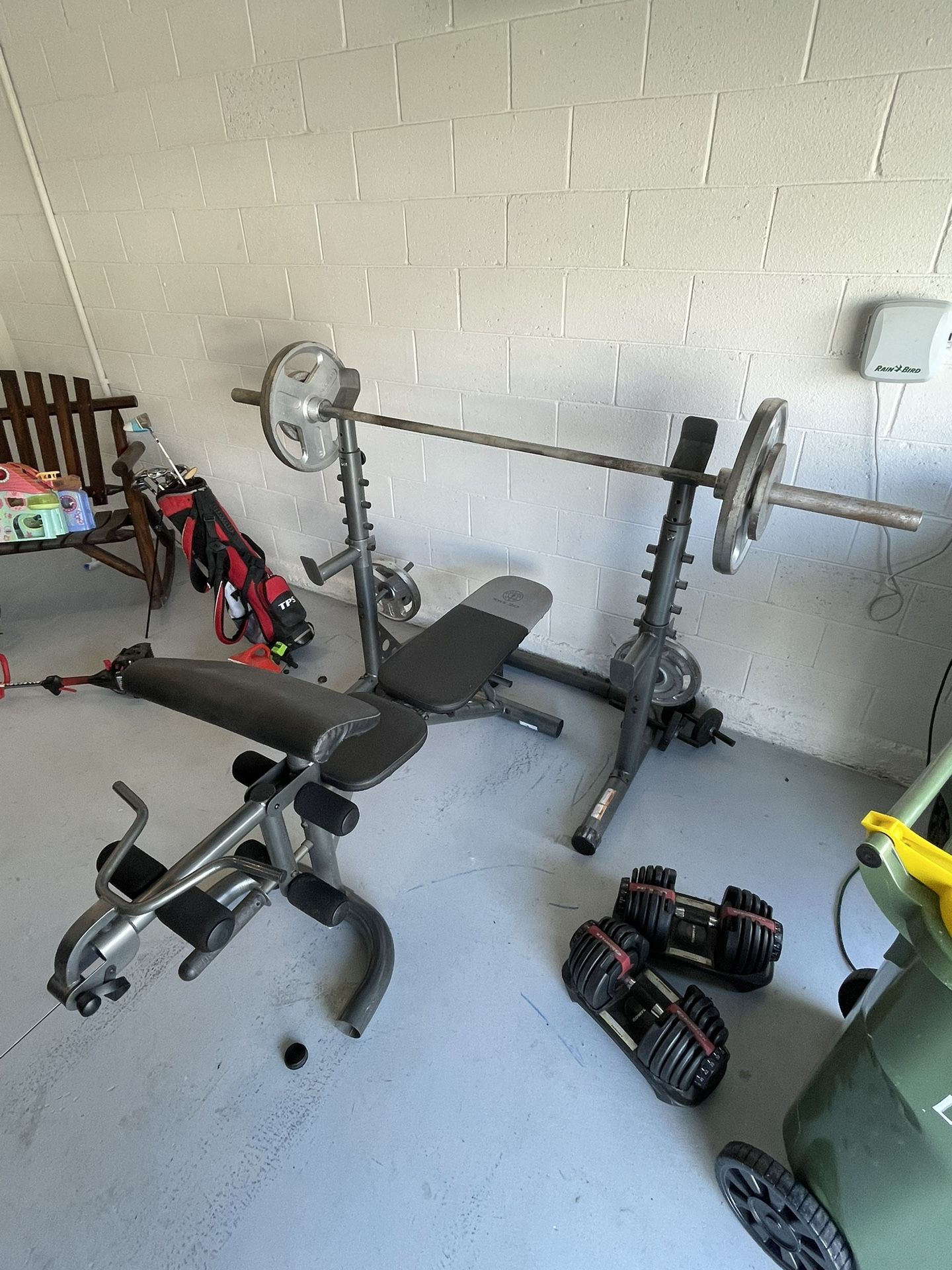 Weight bench with Olympic bar, bench can go incline and decline. Comes with bicep attachment and safety rails. Height of bench can be adjusted 2 45’s 2 25’s 2 10’s 2 5’s Dumbbells not included