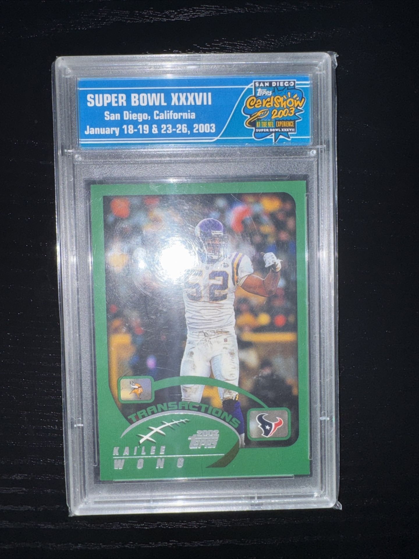 The TOPPS Card Show 2003 features a graded National Football League (NFL) trading card set from 2002 Topps, with a focus on player Kailee Wong from the Houston Texans. This exclusive NFL Experience PSA insert set is authenticated by Professional Sports Authenticator (PSA) and includes card number 180 from the 2002 season. As part of the base set, this football trading card showcases the athlete in a high-quality format for collectors and fans alike. It was a PSA exclusive when the Super Bowl was in San Diego in 2003.