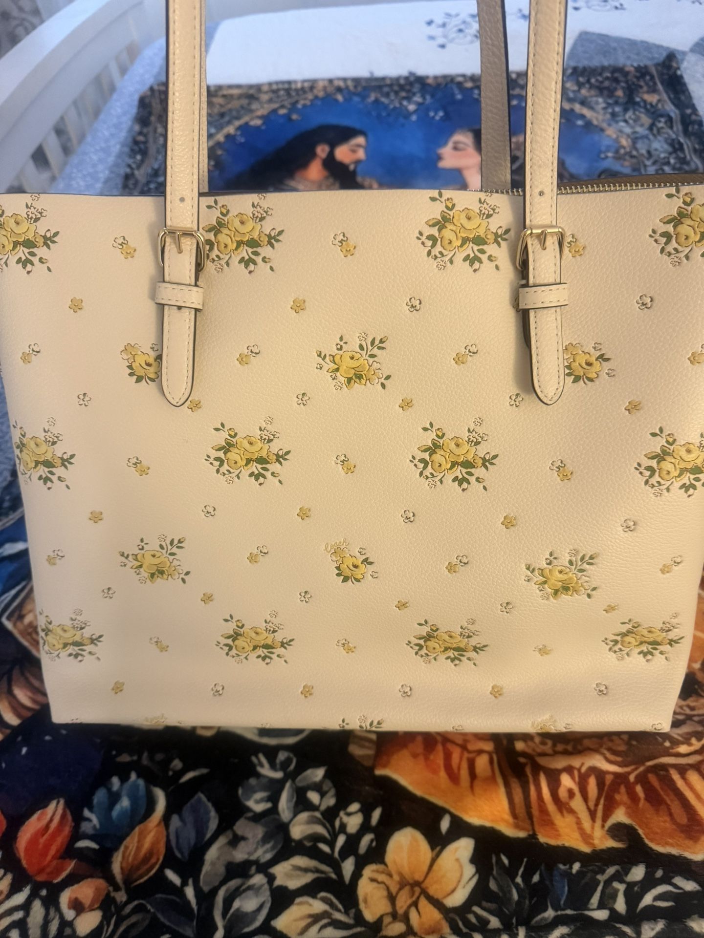 Coach Floral Print Tote Bag Elegant Coach tote bag crafted in smooth leather with a delicate floral print design. Features long shoulder straps, top zip closure, and a spacious interior perfect for daily use. Chic, feminine, and versatile — ideal for work, shopping, or everyday style.