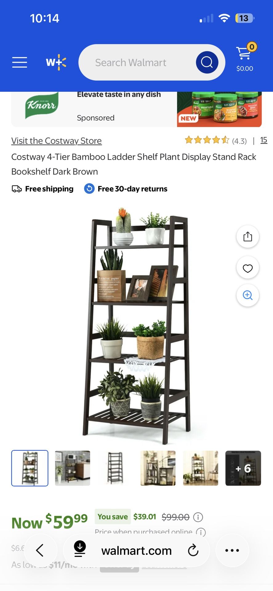 Costway 4-Tier Bamboo Ladder Shelf Plant Display Stand Rack Bookshelf Dark Brown