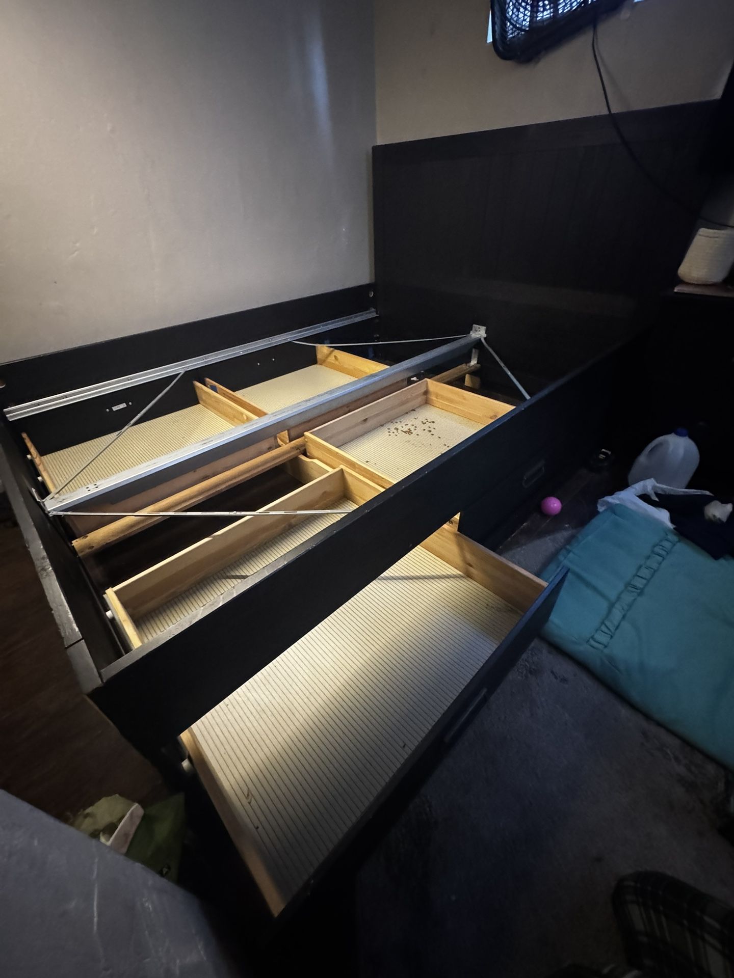 Used Queen size bed some cracks on frame but very sturdy doesn’t affect drawers or use