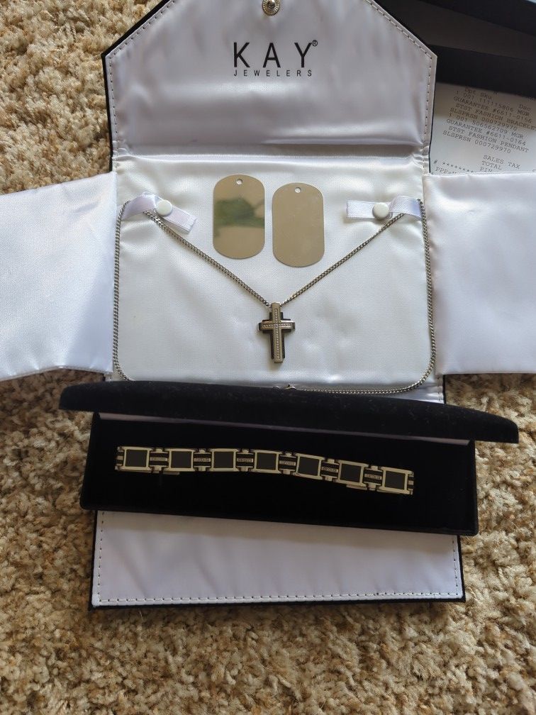 Brand new men's jewelry from Kay Jewelers. Comes with case and box. Receipt shows original prices. Impress your man with a stylish gift! Bracelet - 200 Neck Chain - 275 Matching set - 450