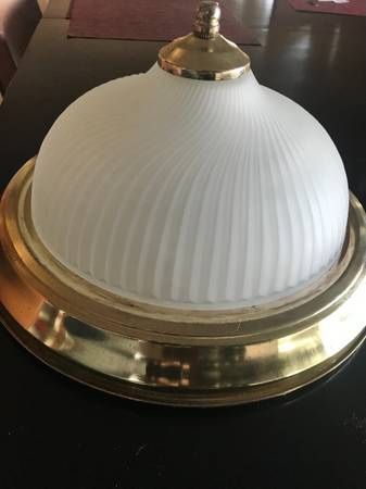 11" Diameter Flush Mount Ceiling Light with Frosted Shade in rippled swirling pattern and brass-like ceiling base mount. In excellent condition. Takes one bulb and is 11" x 7" tall.