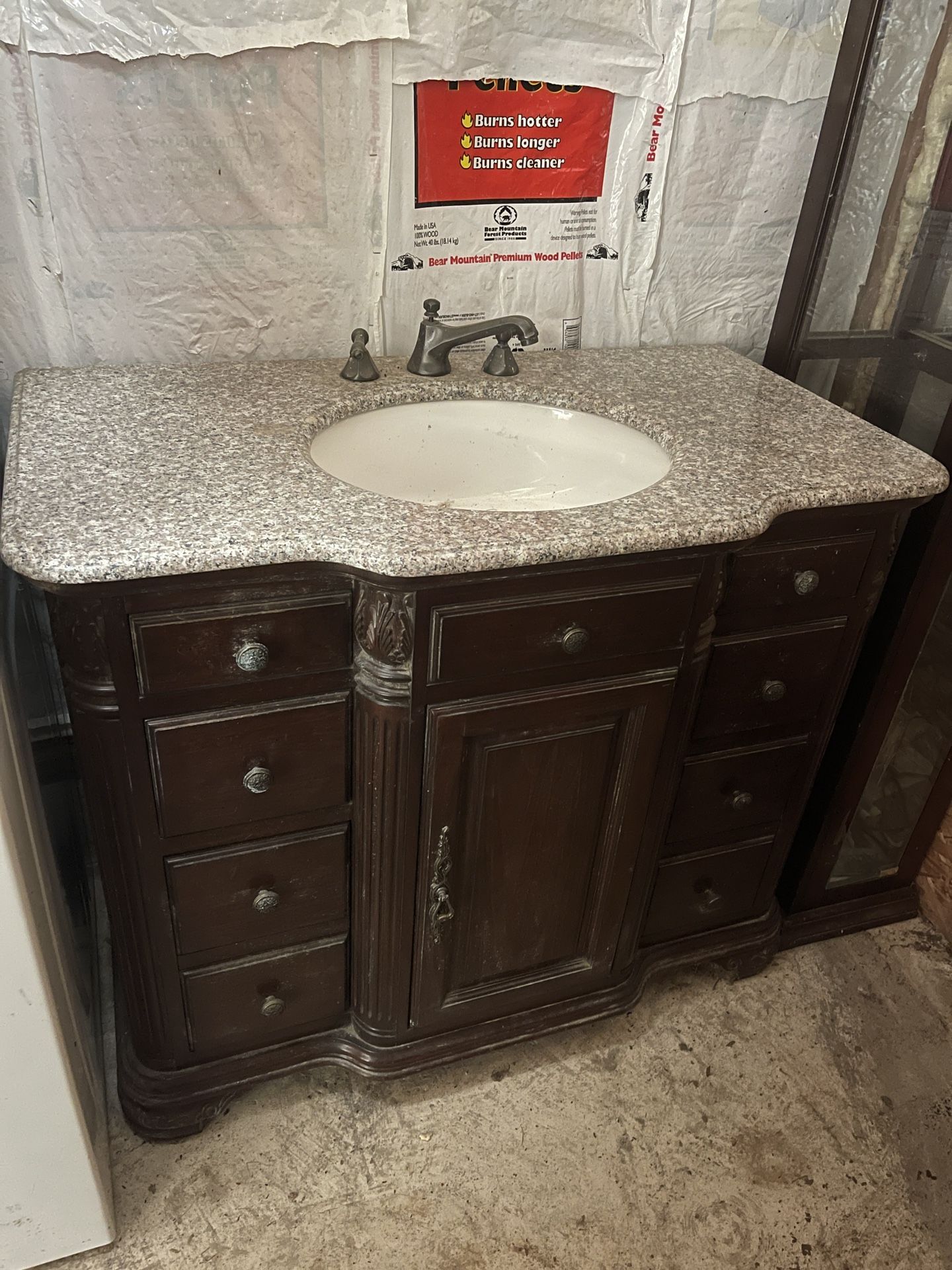 Bathroom vanity 24” deep, 42” wide by 36” tall Mahogany colored real wood with detailed carvings. Granite countertop with sink and dark nickel faucet. Needs a cleaning but in great condition. You pickup in Brownsville. Delivery possible depending on area. $249 OBO