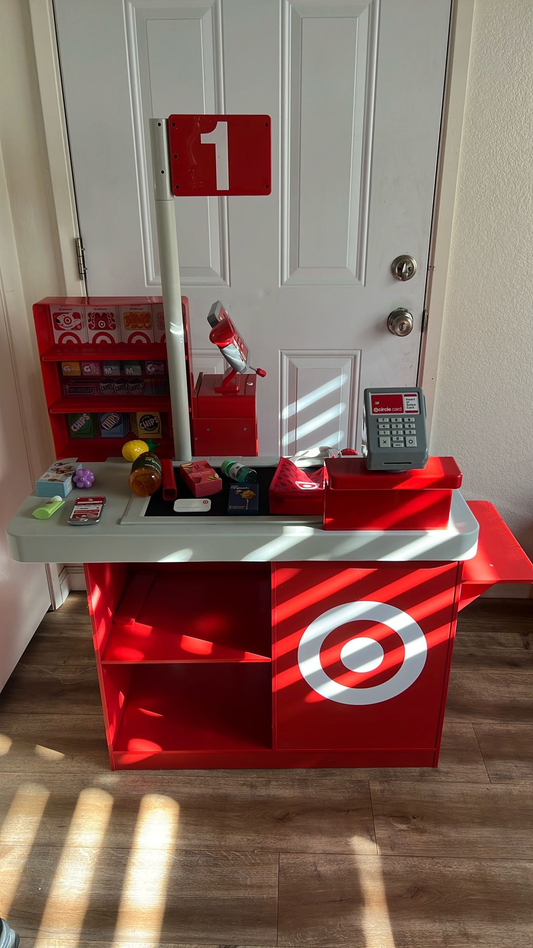 Target toy checklane. It’s in like new condition, no scratches to the wood and it has all the items it originally came with. It already has batteries included that work, nothing is wrong with it. It’s a bit heavy so you will need someone to help you carry it. Smoke free, pet free home Cash/Zelle Pick up only
