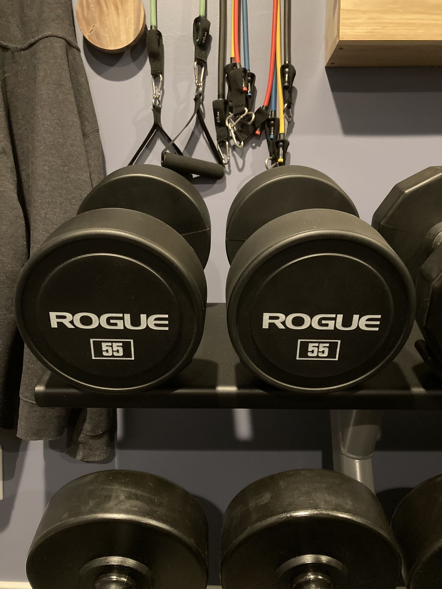 Brand new pair of Rogue Urethane 55 lb weight dumbbells to add to your home gym. These are the top of the line. These cost me $484.12 Make me an offer. Weight plates, bumper plates. Squat rack, adjustable bench, power rack, rig, exercise, train, workout, CrossFit