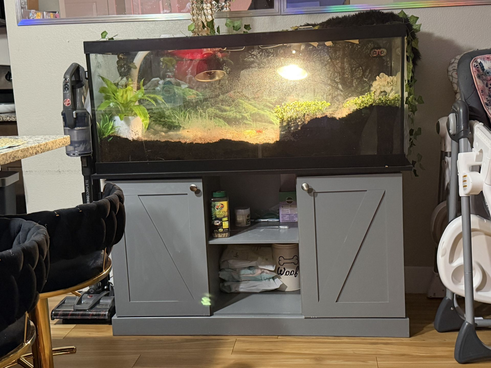 75 gallon, glass top fish tank with grey stand.