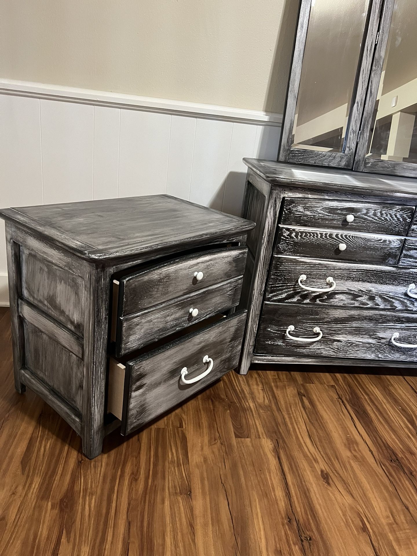 Newly painted solid oak all around dresser and x2 night stands with a 3/ reflective sides mirror top . Blackhawk π¦ will be guarantee of durability and Delight//snow tiger black stain edition will be my addition art ! Black stain / and coats of shine ! Works for yrs