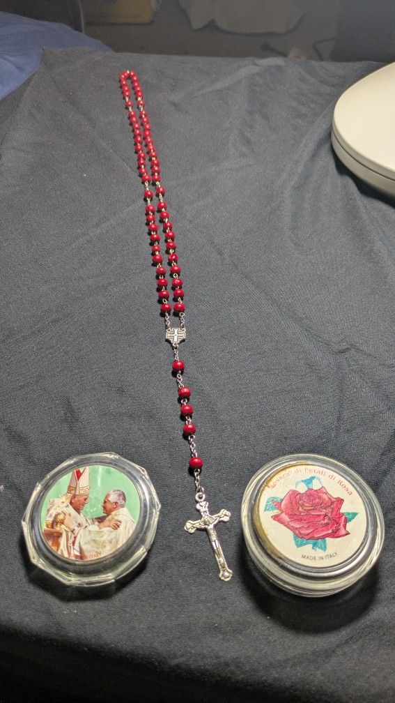 Beautiful wooden rosary believe it's made out of rosewood. The rosary itself has an amazing smell. Comes with a case. The rosary is 19 in Long and is from Italy