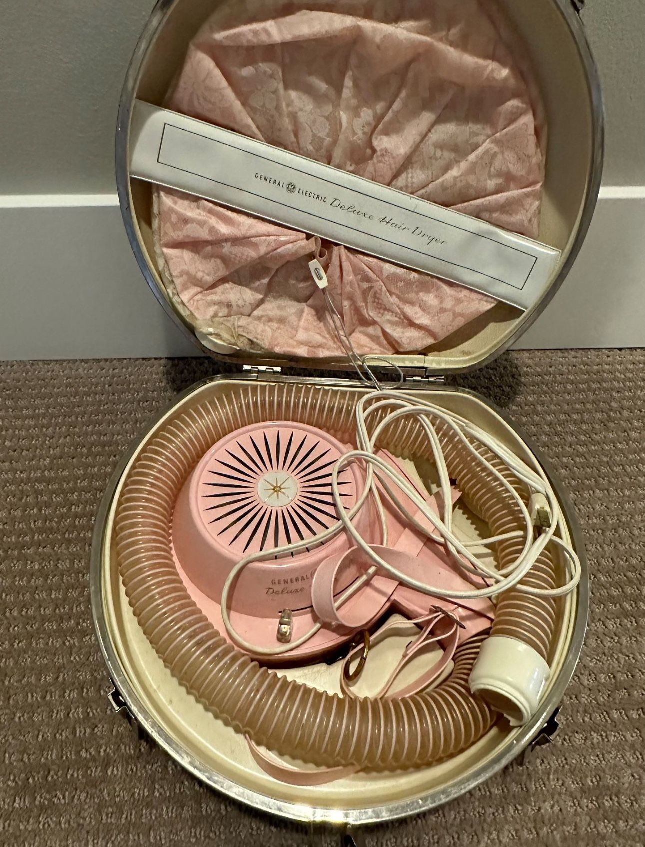 Recondition vintage hairdryer from the 1950s. Excellent condition the only flaws are the two holes in the bottom of the case. Everything is here and complete.