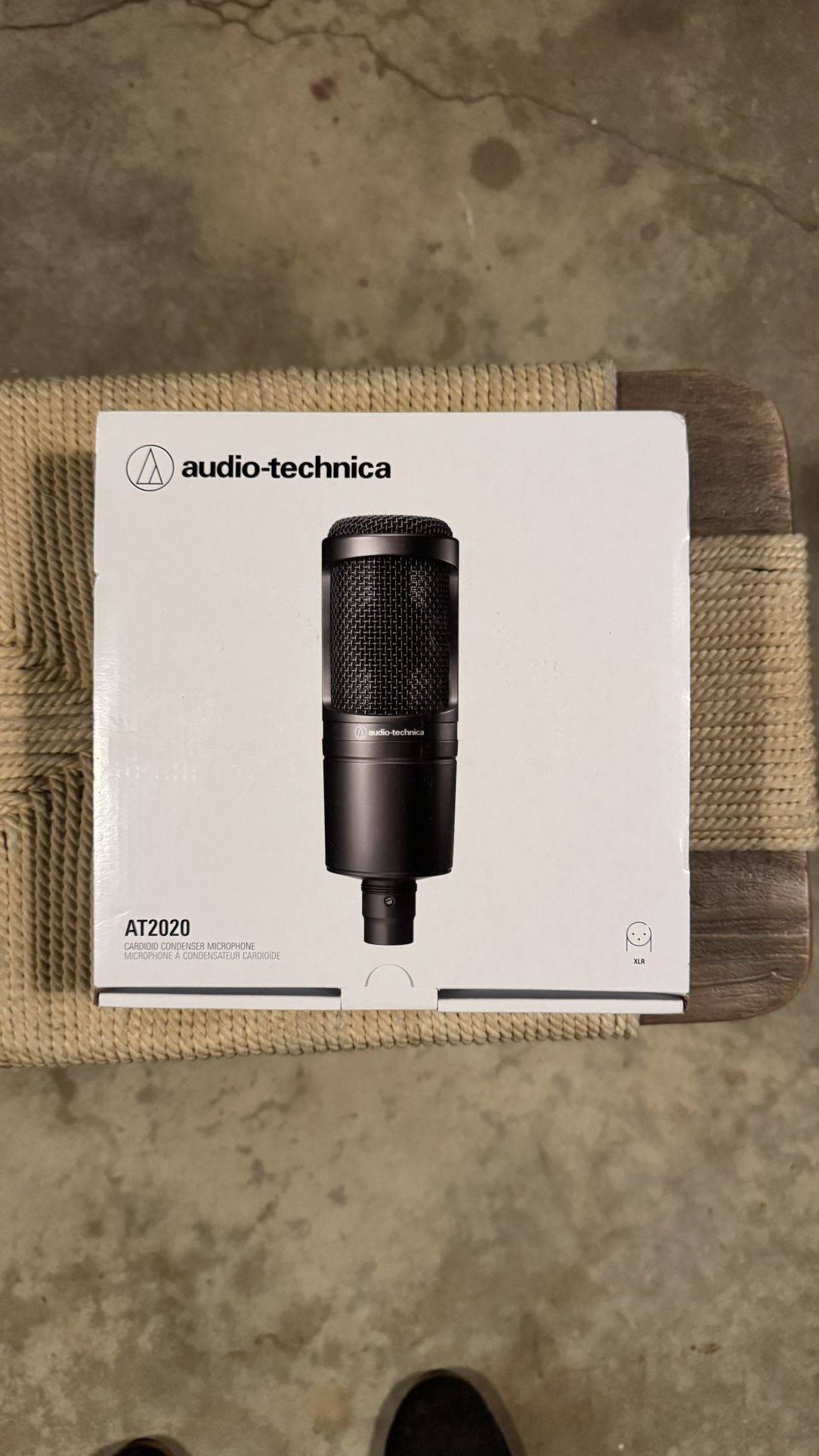 For pickup only. Brand new Audio-Technica AT2020 cardioid condenser studio microphone. It’s still in the original box, never used, and in perfect condition. Ideal for vocals, instruments, podcasting, streaming, and professional studio recording with its crisp, clean, low-noise sound. XLR connection for reliable, high-quality performance.