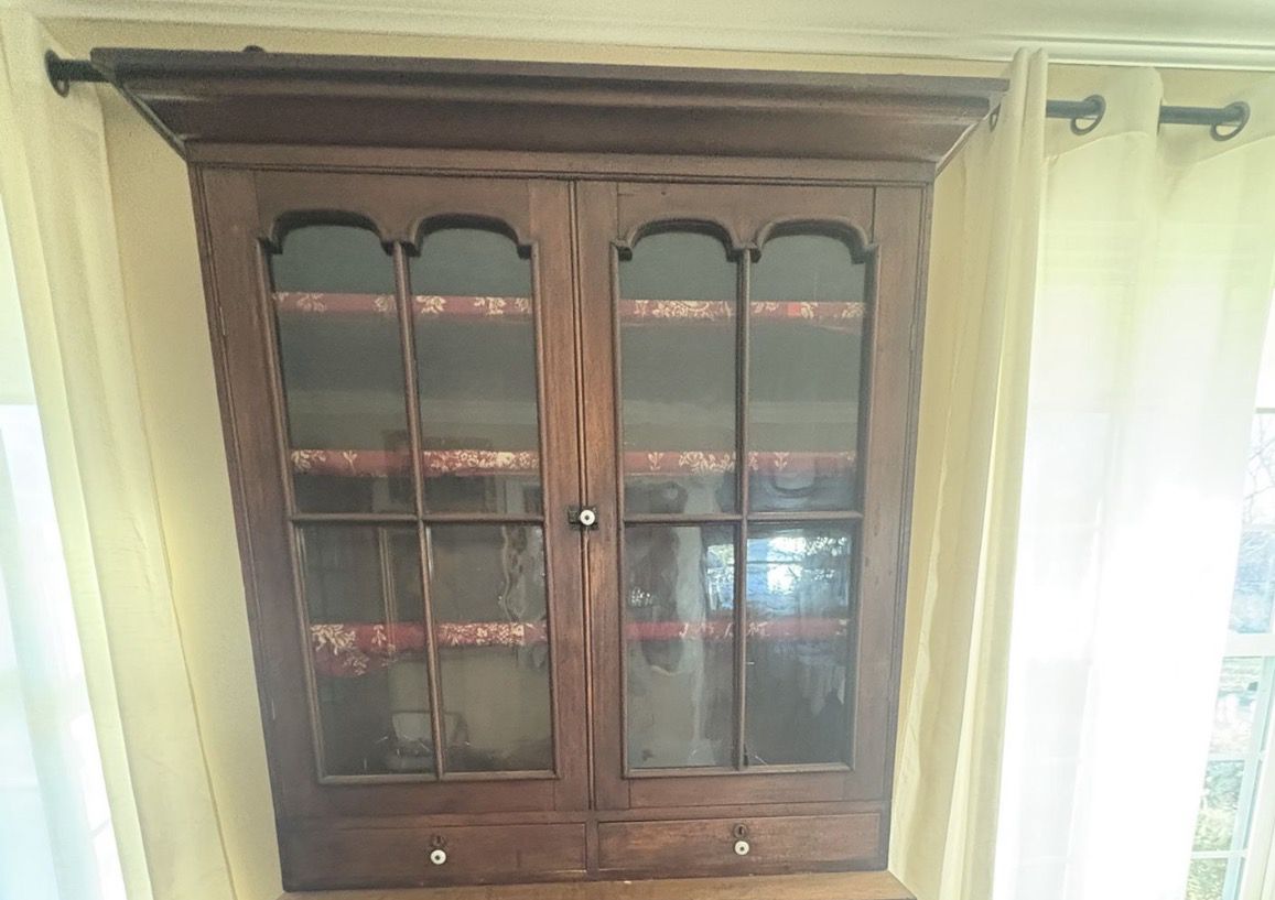 Beautiful early American antique. Solid Walnut wood. Top cabinet hutch. Original glass.
