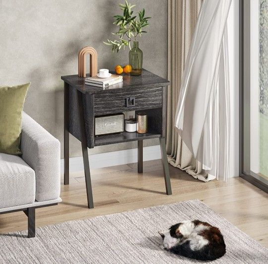 NEW OPEN BOX Highly Versatile: The end table is a classic funiture suitable for any room, especially for small spaces. It not only can be a night table in bedroom, kid's room, but also can be a sofa side table to modernize your living room, study room, apartment, dorm room.etc. Durable & Sturdy: Coffee side table made of scratch-resistant, heat-resistant, water-proof veneered MDF, and reinforced metal table legs.The table top load bearing capacity is up to 40lbs. Sufficient Storage Space: The nightstand features a smooth-gliding drawer with a sleek metal handle and a open shelf which offer ample room for all the necessary night-time accessories. Free to place the lamp, remote control, books, alarm, decors, books etc. Ingenious Design: Embrace industrial styling to complement your contemporary interior with this night stand. The humanized nature of the nightstands is shown by the trapezoid design against falling, the embedded screws to prevent scratching. Curved corner makes this side table safe to use. Easy to Assemble