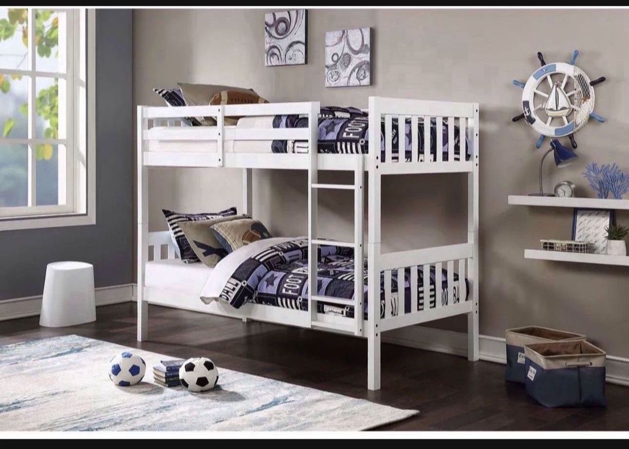 New In Box Twin Size, With 2 Mattress The bunk bed comes in boxes and you have to assemble it. 78.25"W x 42"D x 64"H (Blankets and pillows are not included) We can deliver Se habla español. 8434