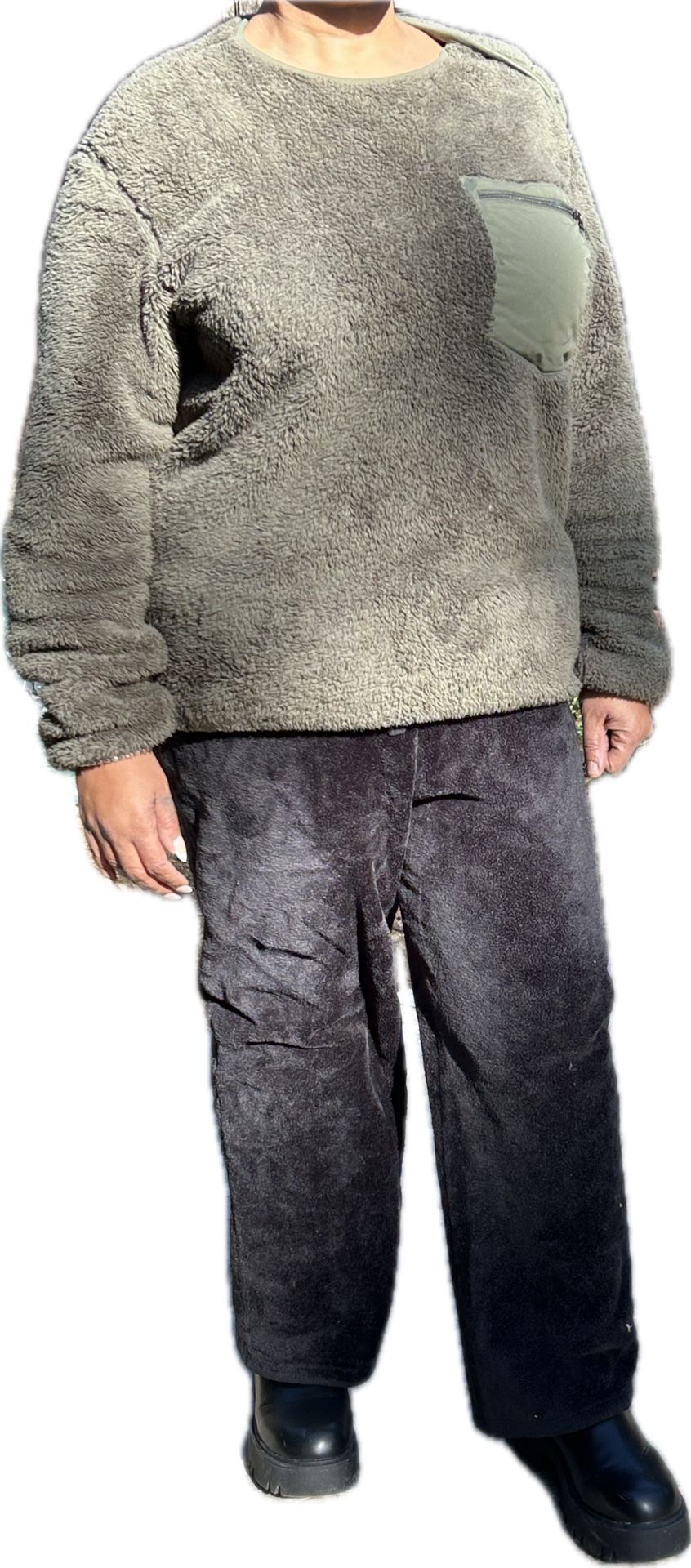 Stay effortlessly stylish and cozy with this ultra-soft outfit, perfect for chilly days. The oversized fleece sweater, in a soothing olive green hue, features a chic chest pocket detail for added functionality and charm. Its plush texture offers unmatched comfort, making it ideal for lounging at home or layering up for outdoor errands. Paired with luxuriously soft, black velour pants, this ensemble combines relaxed fit and modern elegance. The pants feature a high-waisted design, providing both warmth and a flattering silhouette. Complete the look with sturdy black boots for a touch of edgy sophistication. This outfit is versatile, practical, and timeless—whether you’re enjoying a lazy day indoors or stepping out in style, it’s got you covered!